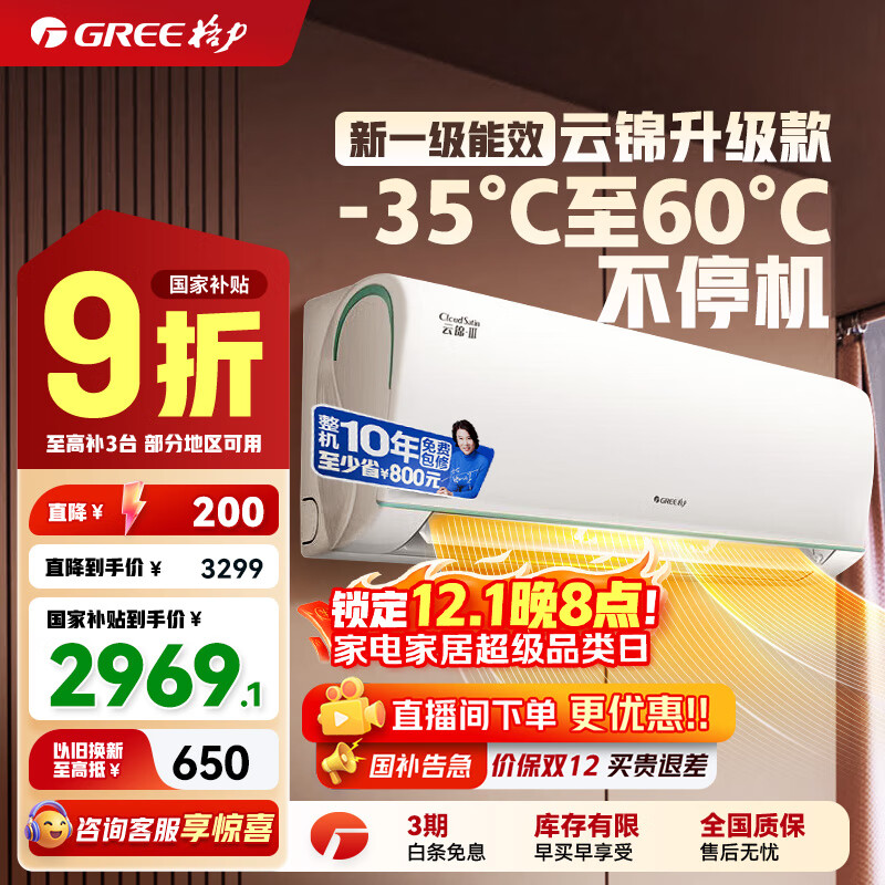 格力(GREE)空调挂机云锦三代/云锦pro新一级能效变频冷暖 自清洁 WIFI壁挂式卧室空调挂机 家电补贴20%空调 1.5匹 云锦三代新升级款