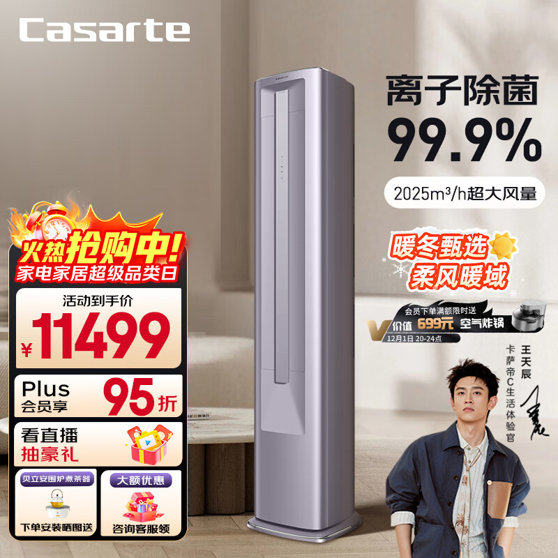 推荐理由:卡萨帝星悦尊享版3匹空调凭借其卓越性能脱颖而出。这款空调的最大风量达2025m³/h,能迅速覆盖整个客餐厅,为用户提供强劲的风量体验。另外,它拥有2.5分钟快速循环全屋空气的功能,实现一键冷暖,温度均匀分布,全空间温差小于0.5°C,带来衡温舒适的居住环境。高效除菌率高达99.9%,确保空气质量,呵护家人健康。