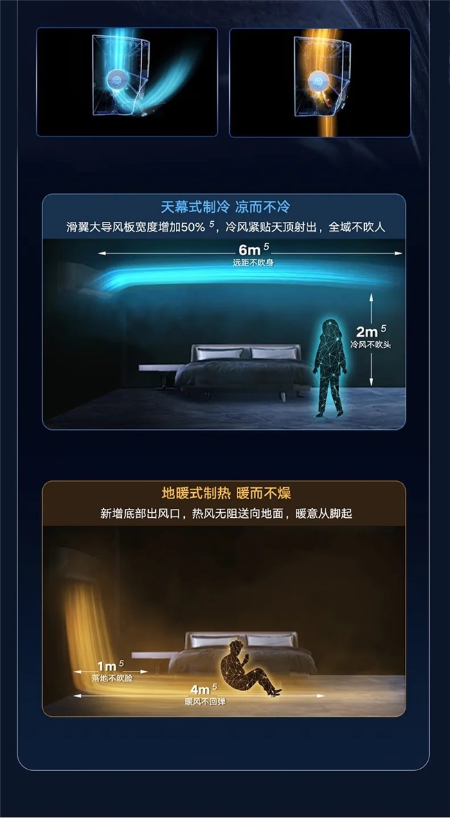 此外,传统空调直吹带来的不适感常被视为睡眠的“隐形杀手”。格力“星梦”挂机空调创新采用双驱冷暖分送科技,彻底改变了空调出风方式:制冷时,冷风贴壁自然沉降,如天幕般洒落凉意;制热时,热风贴地蔓延,似地暖般温暖自下而上。这种“柔羽风感”消除了室内温差,为人体带来舒适温润体验,却察觉不到风的扰动。